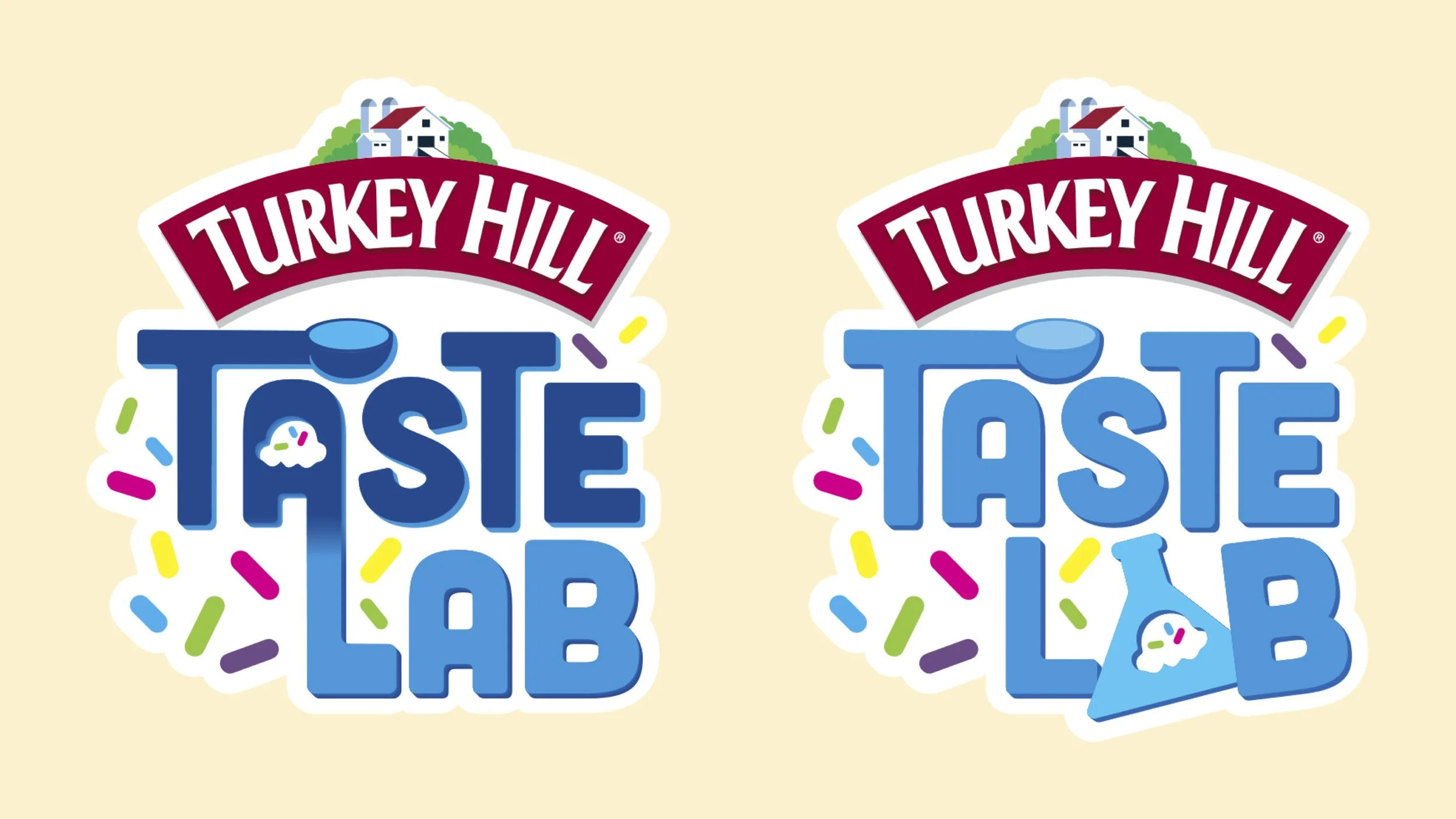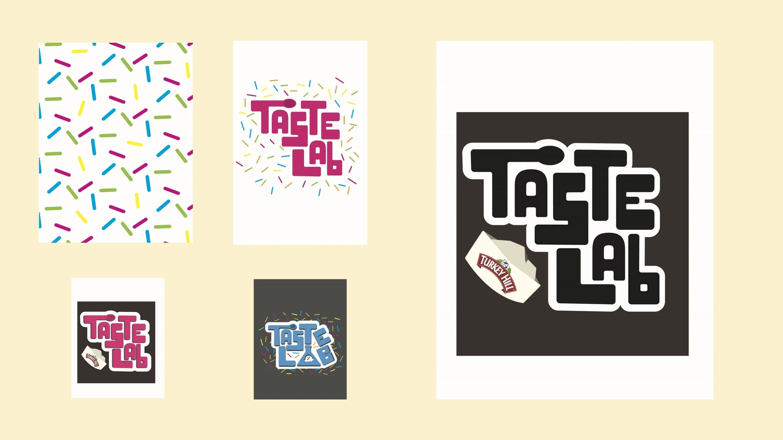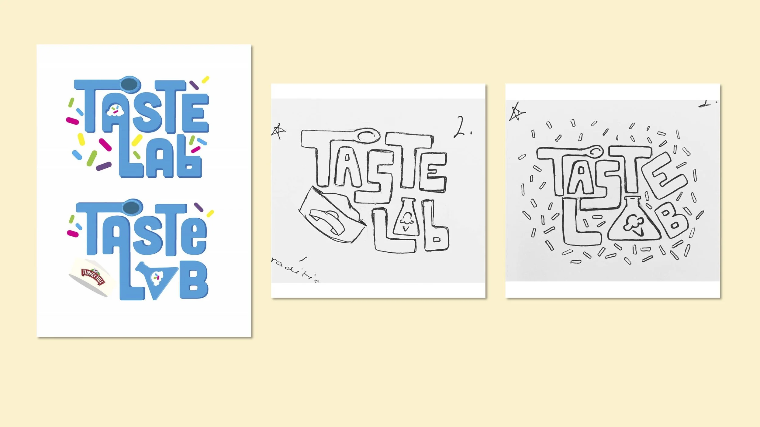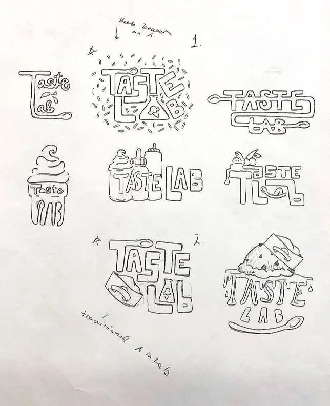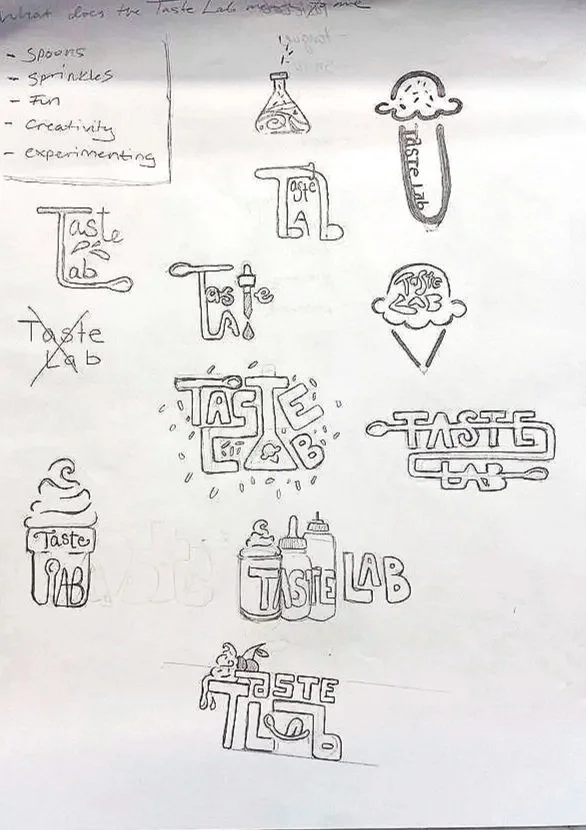 My main project for the rebrand was the Taste Lab Logo design. It began with sketches that resembled ice cream shapes, sprinkles, science droppers, lab equipment, graphics that translated to the activity that guests would be doing in the lab. I wanted it to be fun but clear and to the point, highlighting the laboratory/custom aspect.
